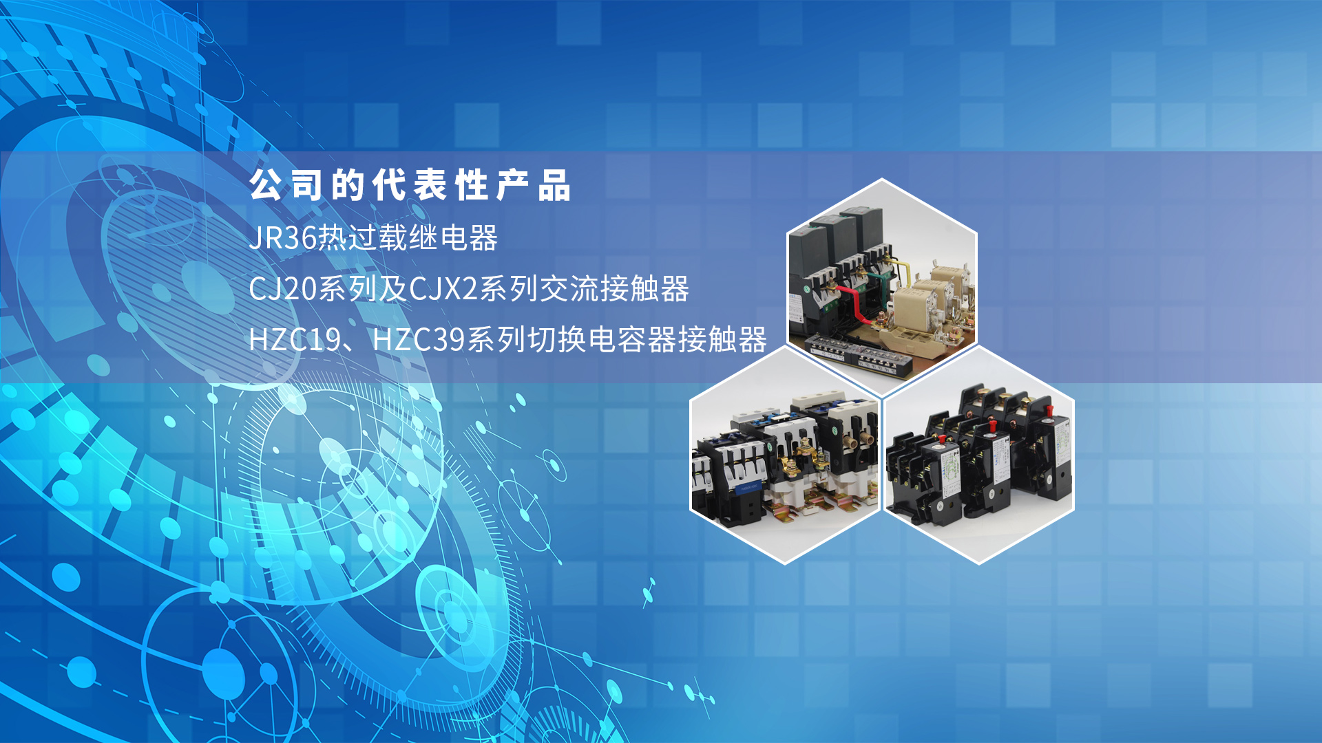 公司的代表性產品HZC19、HZC39系列切換電容器接觸器、CJ20系列及CJX2系列交流接觸器和JR36熱過載繼電器。好的產品質量廣受用戶的信賴。多年來公司不斷完善產品系列和規格,陸續推出HZC39系列大電流等級的切換電容器接觸器、JR20系列雙金屬片式熱過載繼電器及HZG系列切換電容器接觸器組合,得到廣大用戶歡迎和青睞。